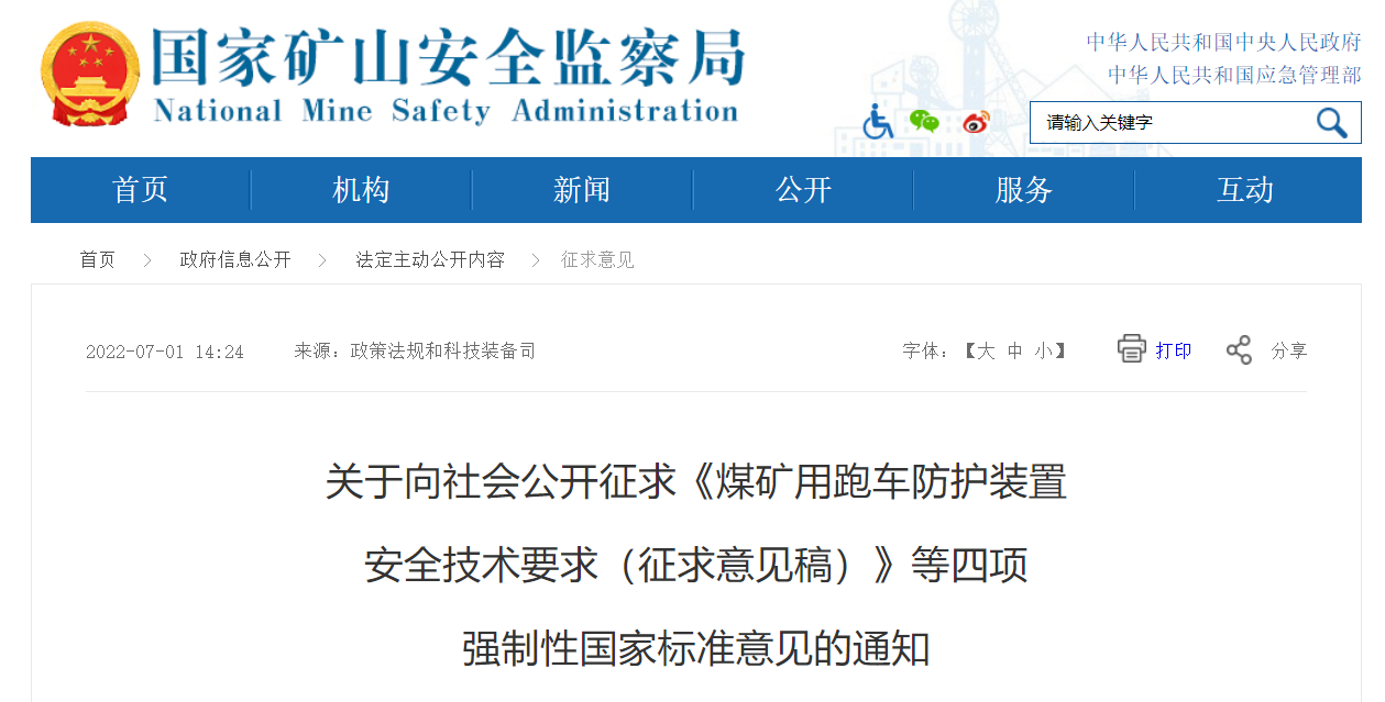国家矿山安全监察局向社会公开征求《煤矿用跑车防护装置安全技术要求》意见稿!