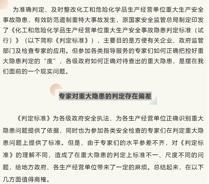 总之,各级政府和专家们要正确应用好《判定标准》,通过不断学习,加强沟通交流,正确把握重大隐患判定的“度”,既不能给企业、政府带来非必要的麻烦,也不能为企业安全生产留下一丝的安全隐患。