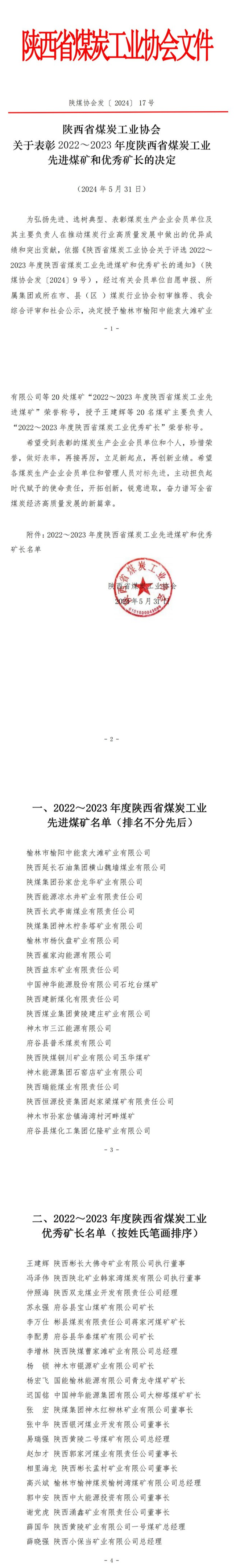 陕西省煤炭工业先进煤矿和优秀矿长名单公布