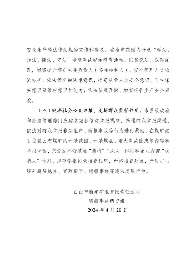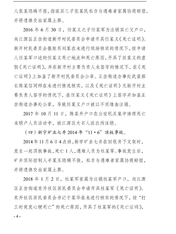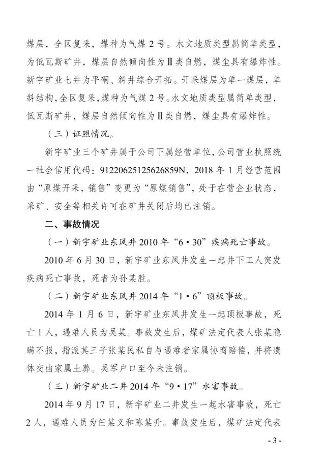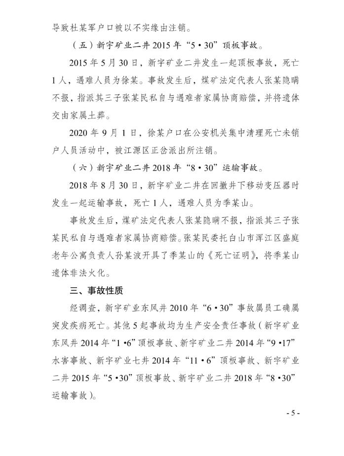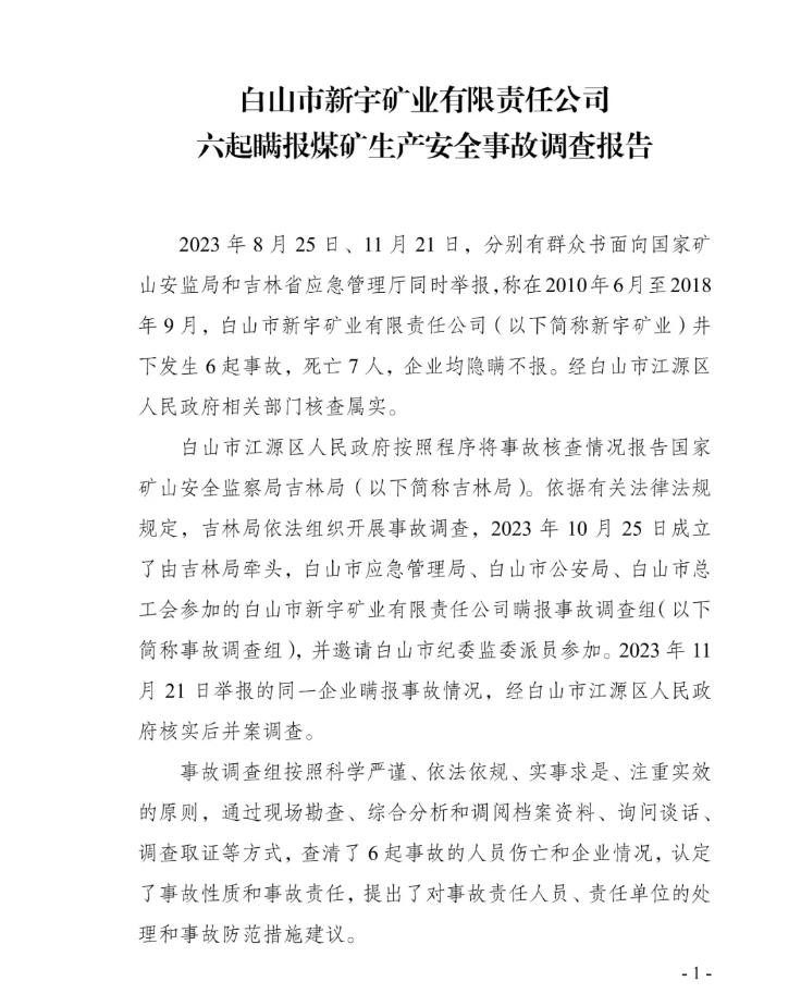 2023年8月25日、11月21日,分别有群众书面向国家矿山安监局和吉林省应急管理厅同时举报,在2010年6月至2018年9月,新宇矿业井下发生6起事故,致7人死亡,企业瞒报。对此,国家矿山安监局吉林局牵头,白山市应急管理局、白山市公安局、白山市总工会参加的事故调查组成立,并对6起事故展开调查。经查,6起事故分别为:新宇矿业东风井2010年“6·30”疾病死亡事故、新宇矿业东风井2014年“1·6”顶板事故、新宇矿业二井2014年“9·17”水害事故、新宇矿业七井2014年“11·6”顶板事故、新宇矿业二井2015年“5·30”顶板事故、新宇矿业二井2018年“8·30”运输事故。6起事故中,除2010年“6·30”事故确属突发疾病死亡外,其余5起均为生产安全责任事故。对上述事故,煤矿法定代表人或矿井实际控制人,均选择隐瞒不报,私自或指派他人与遇难者家属协商赔偿。