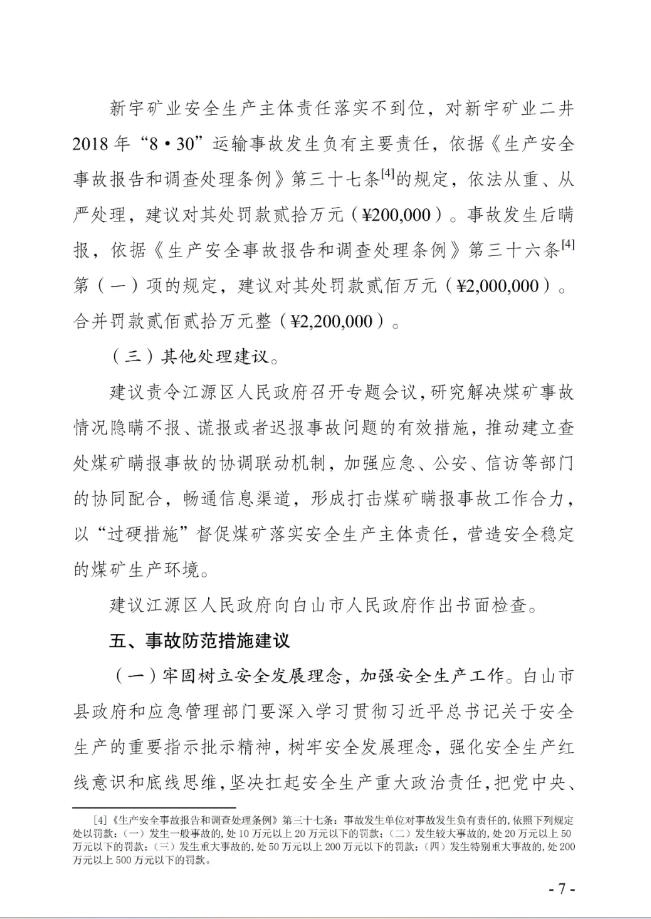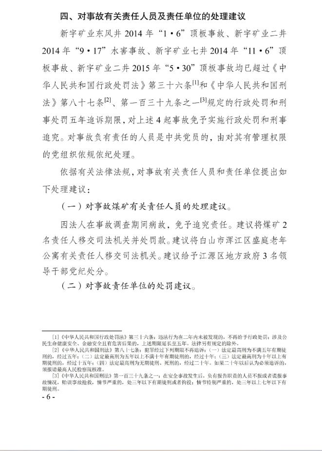 对于事故的相关处罚,因6起事故中的2014年“1·6”顶板事故、2014年“9·17”水害事故、2014年“11·6”顶板事故、2015年“5·30”顶板事故均已超过《中华人民共和国行政处罚法》第三十六条和《中华人民共和国刑法》第八十七条、第一百三十九条之一规定的行政处罚和刑事处罚五年追诉期限,故上述4起事故免予实施行政处罚和刑事追究。但对事故负有责任的人员是中共党员的,则由对其有管理权限的党组织依规依纪处理。另外,对上述事故有关责任人员和责任单位,事故调查组建议,将煤矿2名责任人移交司法机关并处罚款。建议将白山市浑江区盛庭老年公寓有关责任人移交司法机关。建议给予江源区地方政府3名领导干部党纪处分。同时,新宇矿业对新宇矿业二井2018年“8·30”运输事故发生负有主要责任,依据相关规定,事故调查组建议对其处罚款20万元;事故发生后瞒报,建议对其处罚款200万元,合并罚款220万元整。