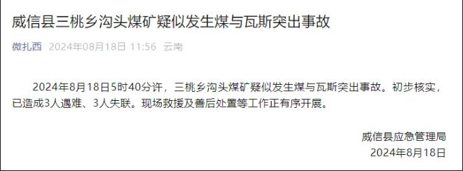云南一煤矿发生事故 致3人遇难3人失联 2024-08-18 浏览量:0 据云南省威信县应急管理局消息,8月18日5时40分许,三桃乡沟头煤矿疑似发生煤与瓦斯突出事故。初步核实,已造成3人遇难、3人失联。现场救援及善后处置等工作正有序开展。 上一篇 下一篇