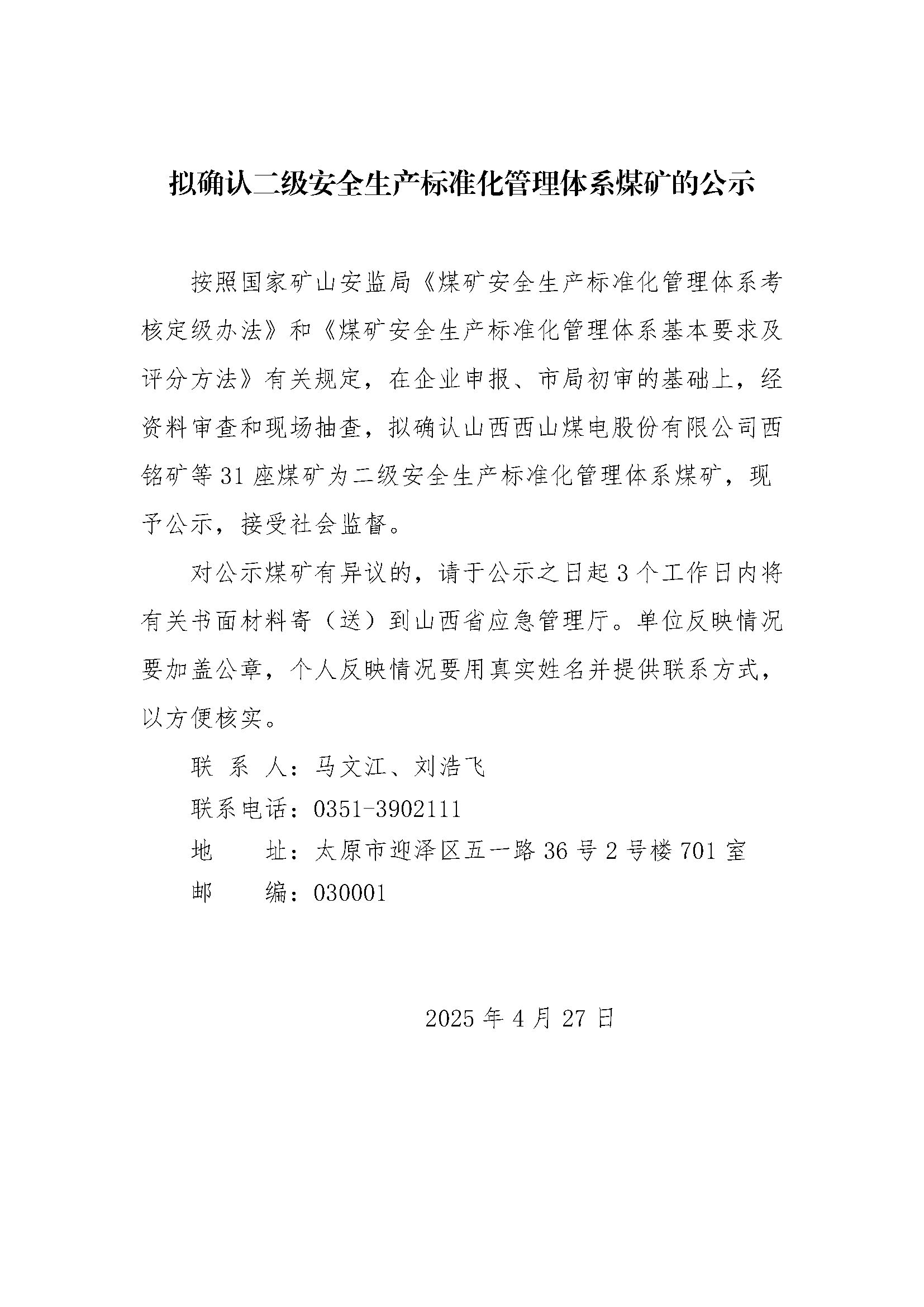 山西省拟确认二级安全生产标准化管理体系煤矿的公示