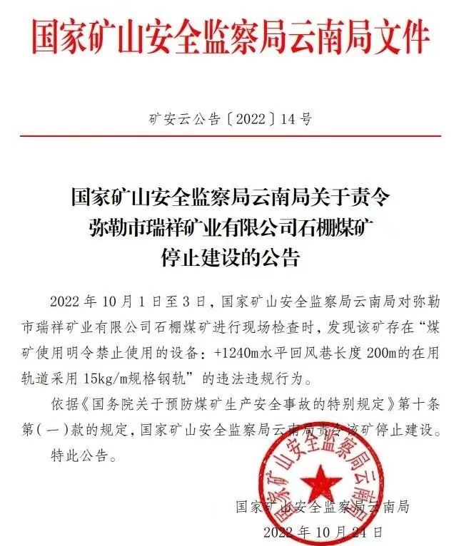 停产整顿!停止建设! 2022-10-31 浏览量:0 国家矿山安全监察局河南局关于责令郑州煤炭工业(集团)有限责任公司芦沟煤矿三五井停产整顿的公告 2022年10月12日,国家矿山安全监察局河南局对郑州煤炭工业(集团)有限责任公司芦沟煤矿三五井进行现场监察,发现该矿存在重大事故隐患,依法作出责令停产整顿15日的行政处罚(豫煤安监一罚〔2022〕1056号)。停产整顿时间:2022年10月22日至11月5日。 依据《国务院关于预防煤矿生产安全事故的特别规定》(国务院令第446号)第十九条第一款之规定,现予公告。 国家矿山安全监察局河南局 2022年10月22日 上一篇 下一篇