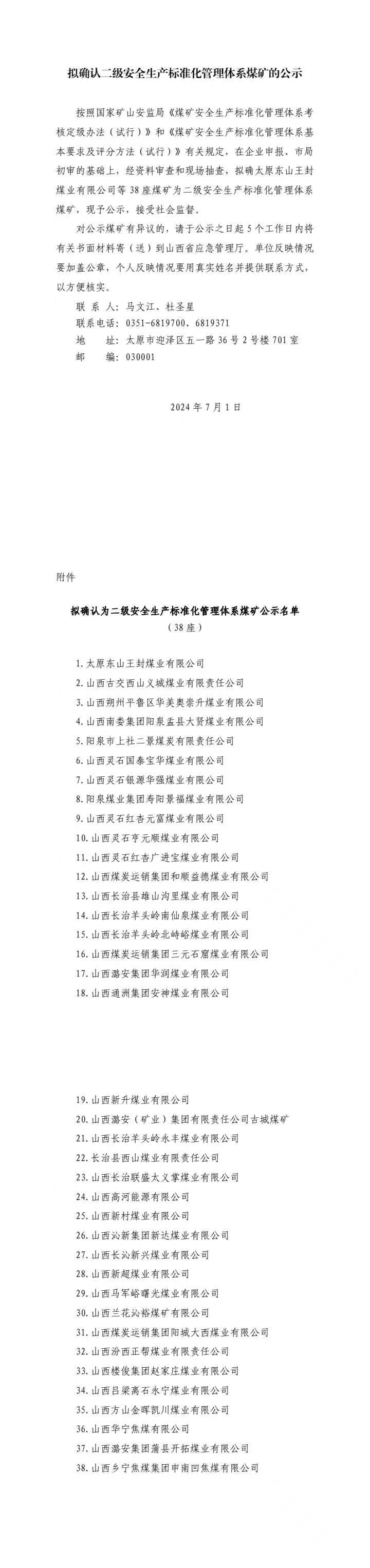 山西省应急管理厅 拟确认二级安全生产标准化管理体系煤矿的公示 2024-07-02 浏览量:0 按照国家矿山安监局《煤矿安全生产标准化管理体系考核定级办法(试行)》和《煤矿安全生产标准化管理体系基本要求及评分方法(试行)》有关规定,在企业申报、市局初审的基础上,经资料审查和现场抽查,拟确太原东山王封煤业有限公司等 38 座煤矿为二级安全生产标准化管理体系煤矿,现予公示,接受社会监督。 公示原文如下:来源:山西省应急管理厅官网 上一篇 下一篇