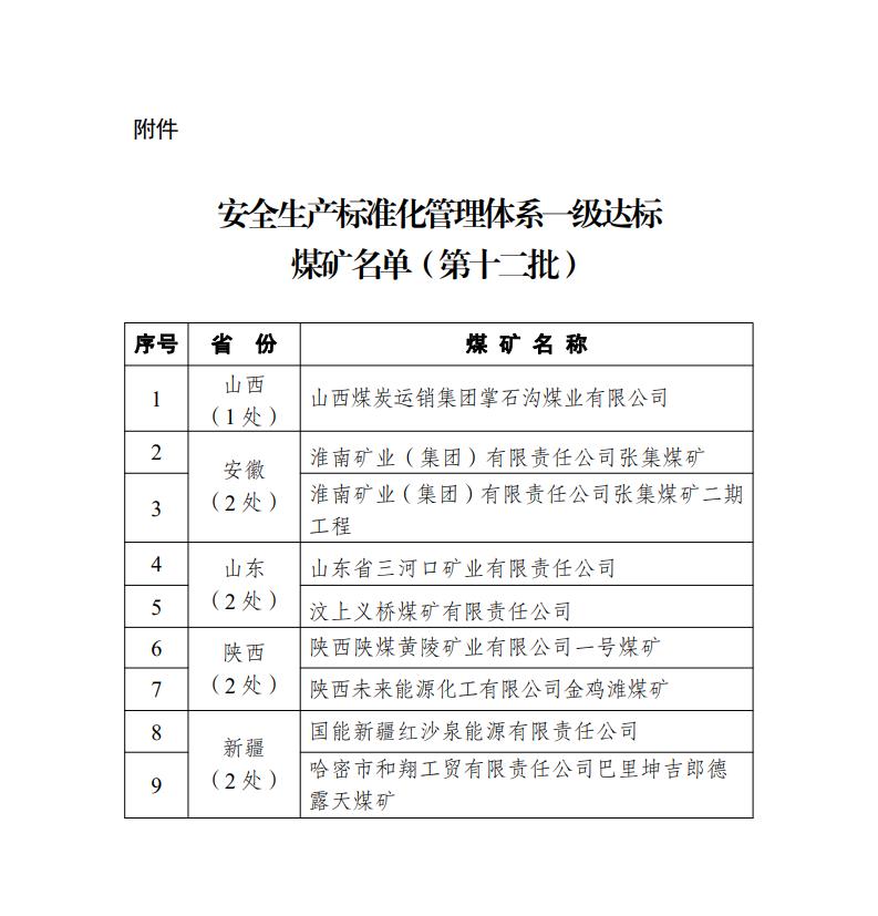公布安全生产标准化管理体系一级达标煤矿名单(第十二批)的通知