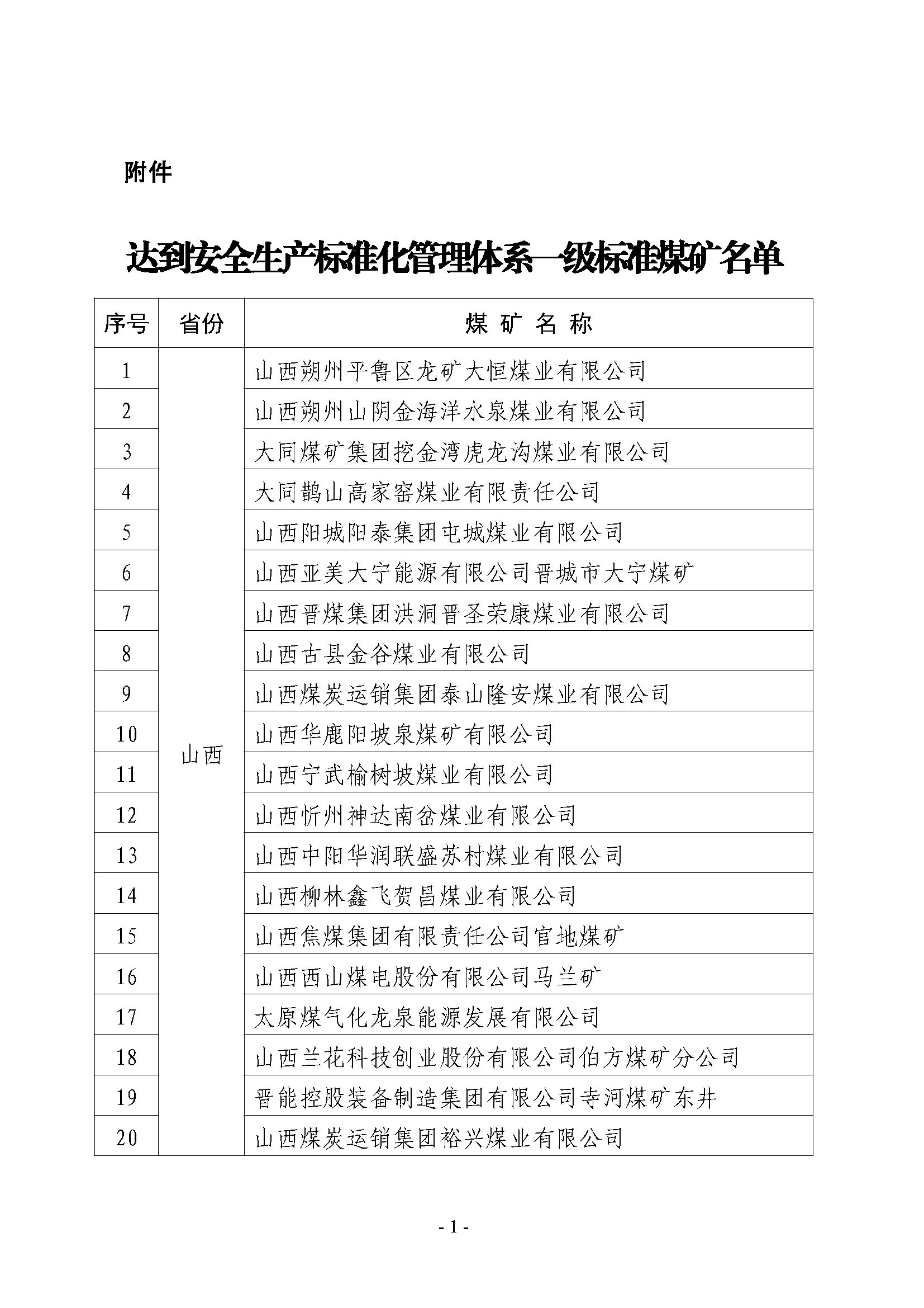 按照《煤矿安全生产标准化管理体系考核定级办法》和《煤矿安全生产标准化管理体系基本要求及评分方法》(矿安〔2024〕109号)的有关规定,经现场检查和抽查,有36处煤矿达到安全生产标准化管理体系一级标准,现予以公示,接受社会监督。公示期间,如发现申报煤矿存在瞒报事故、弄虚作假等违法违规行为的,将依规定取消其申报资格。