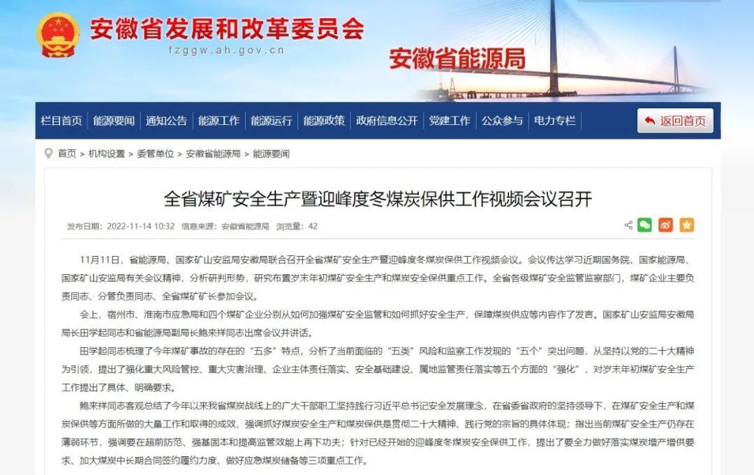 安徽省召开煤矿安全生产暨迎峰度冬煤炭保供工作视频会议